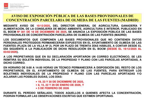 ALIMENTACIÓN, DE LA CONSEJERÍA DE MEDIO AMBIENTE, AGRICULTURA E INTERIOR, PUBLICADO EN EL BOCM Nº 301 DE 18 DE DICIEMBRE DE 2025, SE ANUNCIA LA EXPOSICIÓN PÚBLICA DE LAS BASES PROVISIONALES DE CONCENTRACIÓN PARCELARIA DE OLMEDA DE LAS FUENTES (MADRID)
