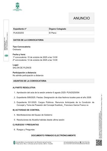 Se informa a todos los vecinos/as que se convoca Pleno Ordinario el día 10 de octubre de 2025 a las 13:00 horas, en 1ª convocatoria y el dia 12 de octubre de 2025 a las 13:00 horas, en 2ª convocatoria.