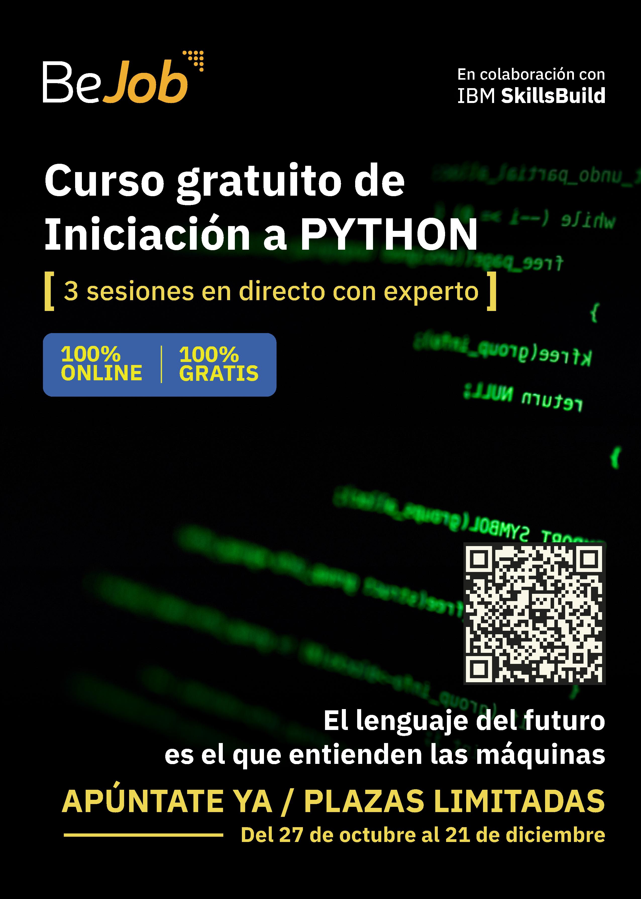 27/10/2025–21/12/2025 (8 semanas; ~70 h). Plazas limitadas. Inscripción: https://www.bejob.com/programas/programacion/introduccion-al-python/. Requisitos: +18 años, residentes en España (prioridad desempleo).