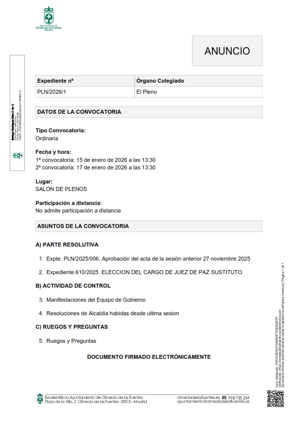 Se informa a todos los vecinos/as que se convoca Pleno Ordinario el día 15 de enero de 2026 a las 13:30 horas, en 1ª convocatoria y el día 17  de enero de 2026 a las 13:30 horas, en 2ª convocatoria.
